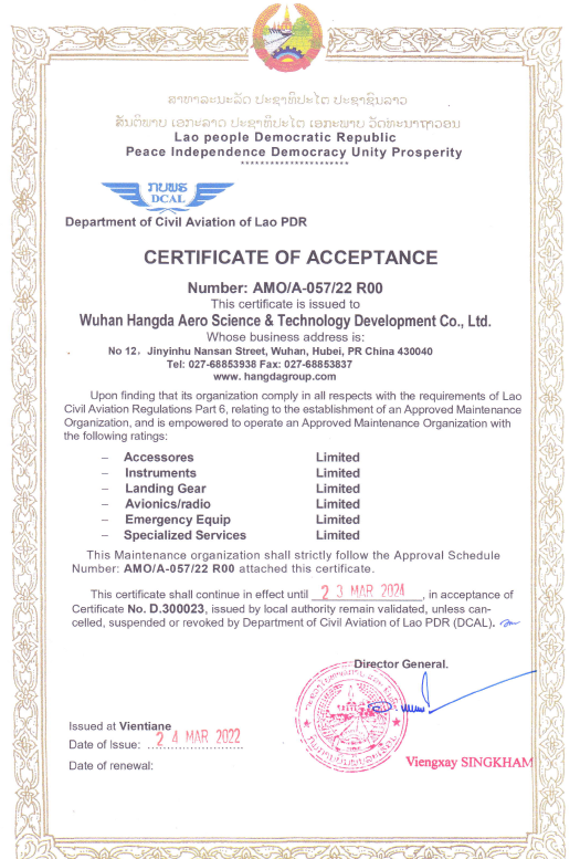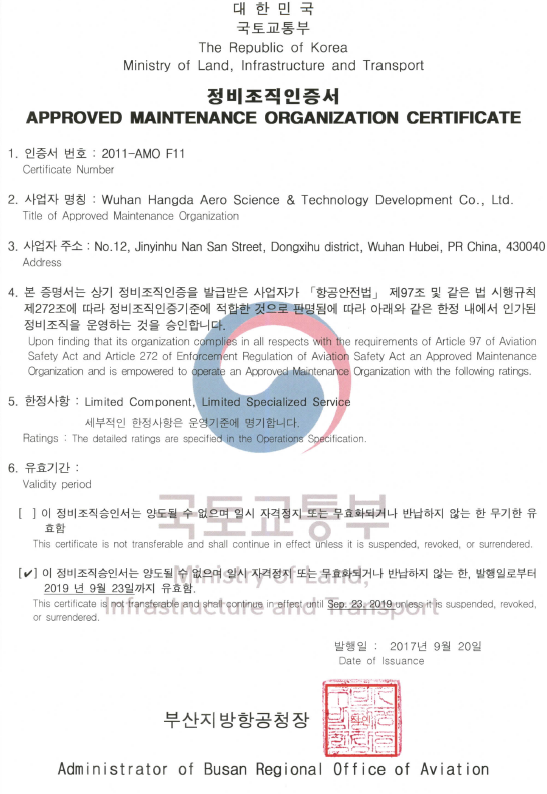 2001年10月 公司獲中國(guó)民航總局授權(quán)的民航維修許可證。